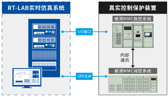 解决方案:客户采用RT-LAB半实物仿真测试平台,交直流电网在CPU中仿真,MMC阀体在FPGA中仿真,被测对象为控保及阀控装置,实时仿真机通过I/O与极控装置相连,FPGA仿真机通过光纤(Aurora协议)与阀控装置相连。